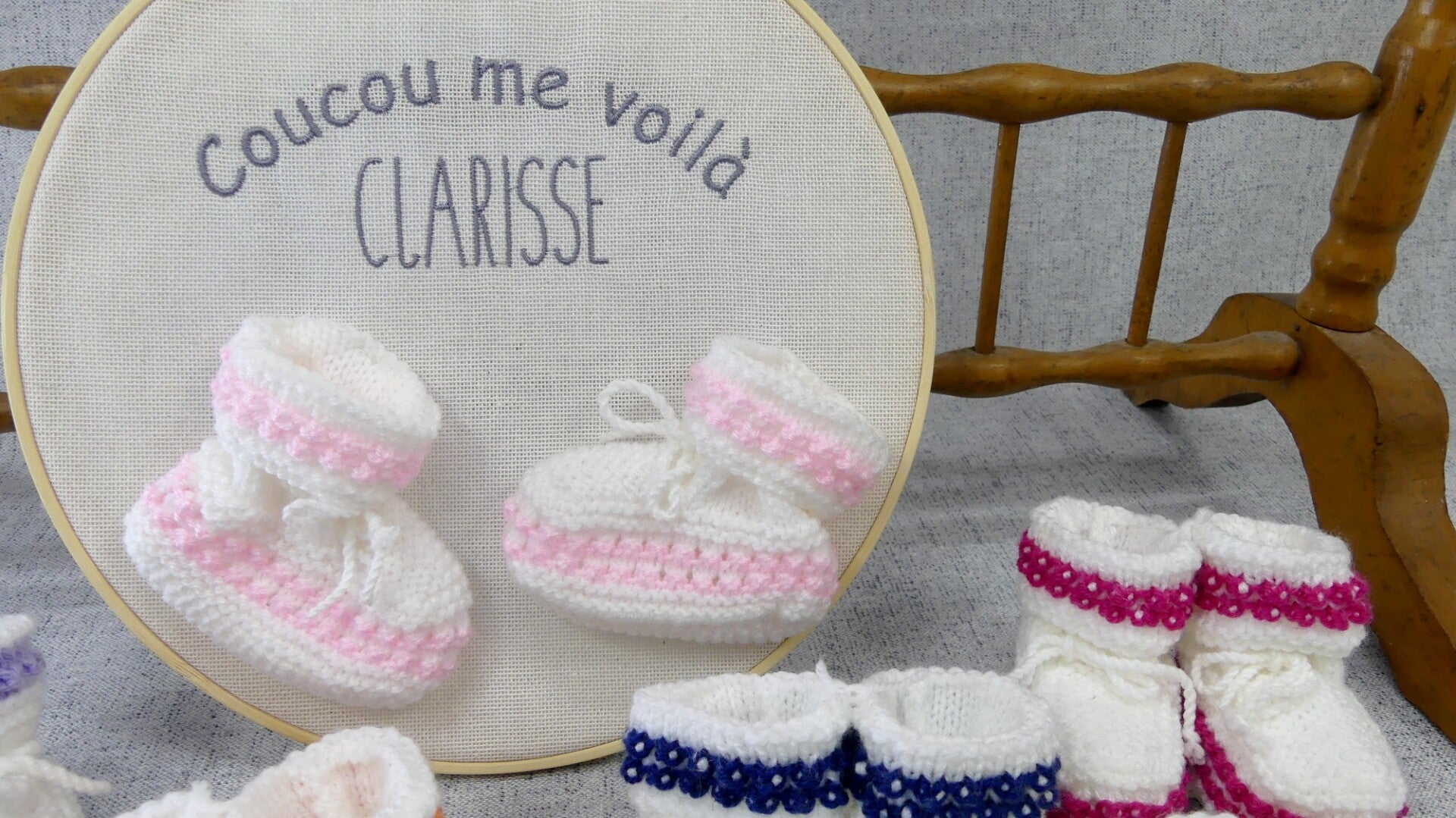 Cadre bois cadeau naissance brodé Coucou me voilà et chaussons layette