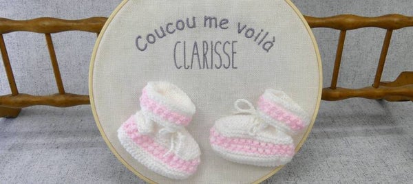 Personnalisable par un prénom ou à offrir pour un Baby Shower. A vous de choisir la couleur des chaussons qui sont cousus.