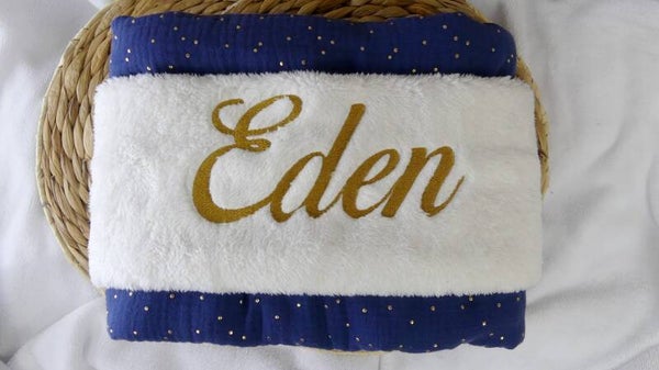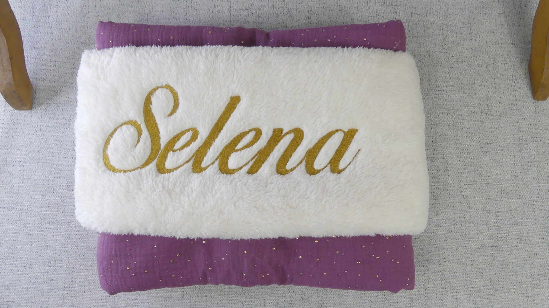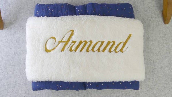La broderie est réalisée à la machine avec un fil de couleur doré. Le prénom mesurera environ 25 x 6 cm, selon le nombre de lettres.