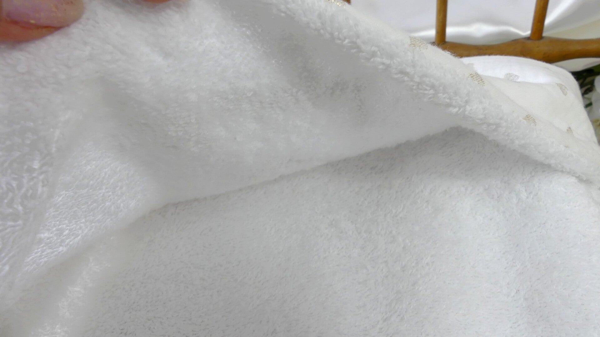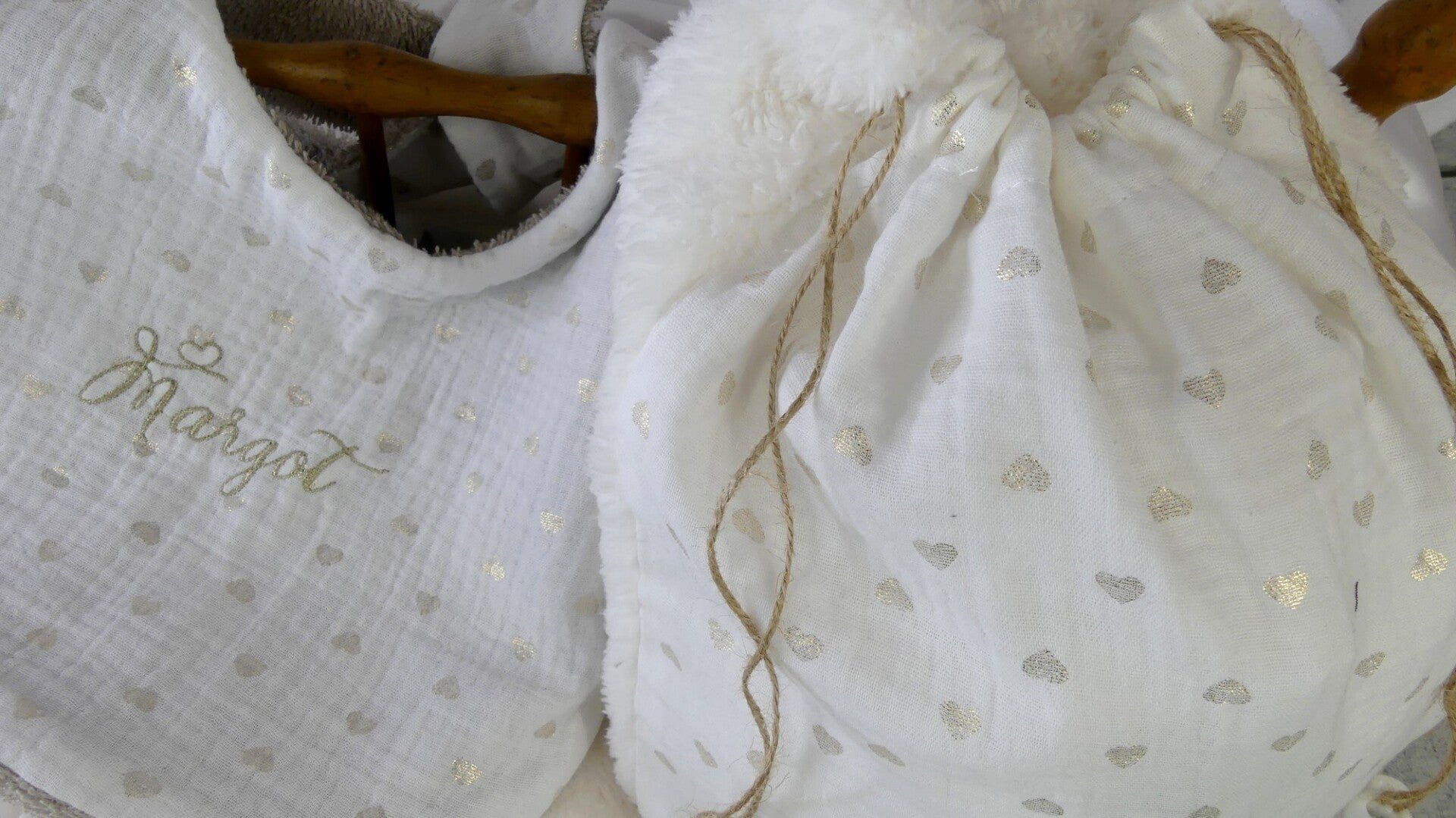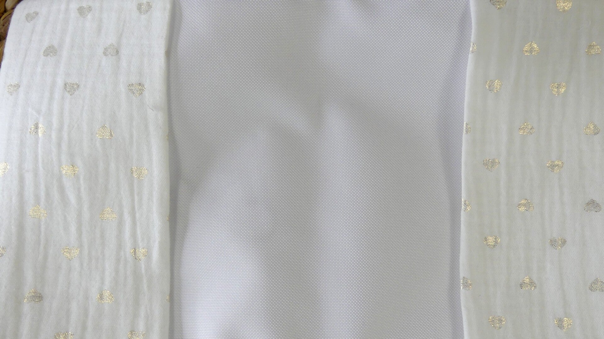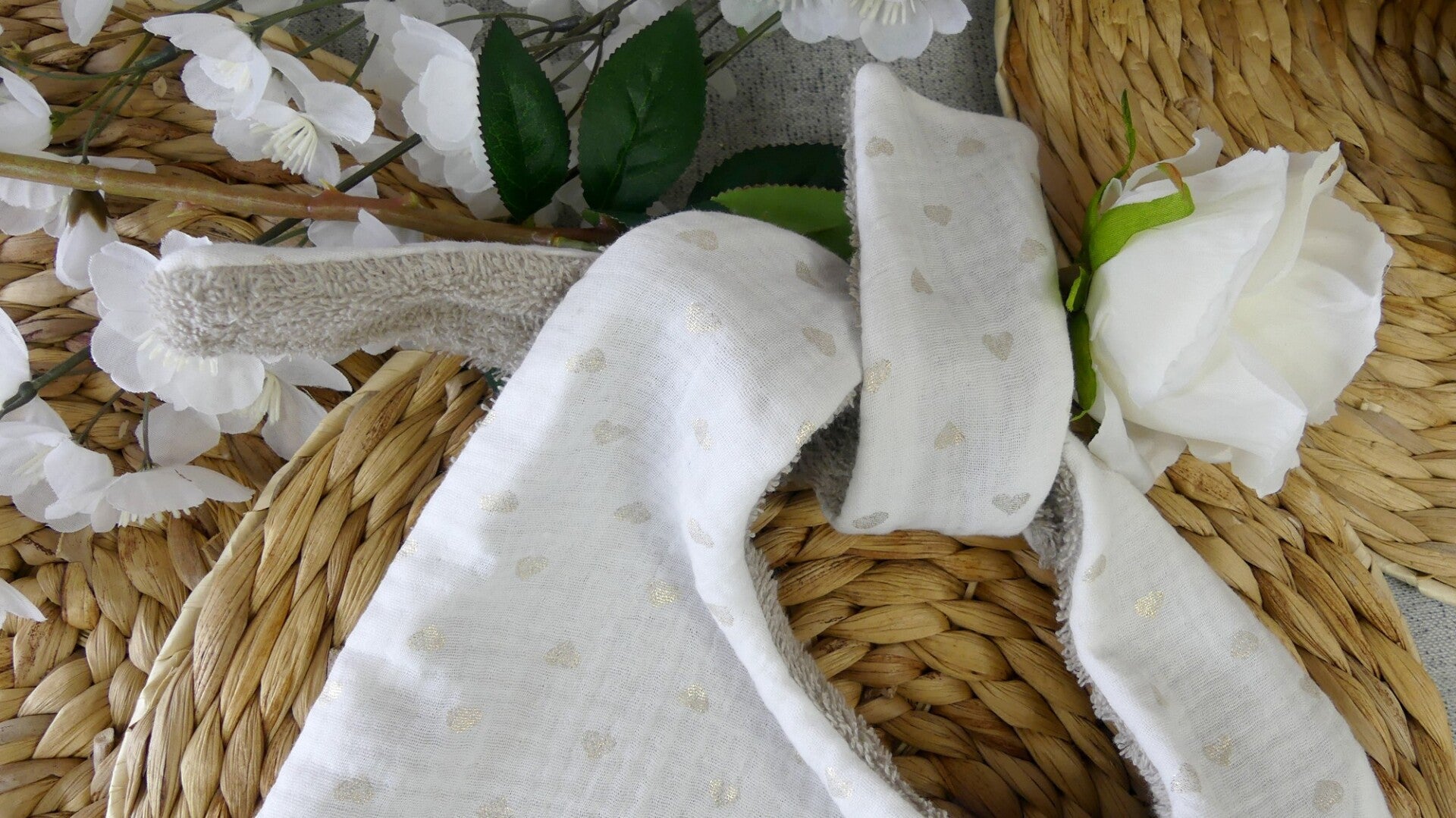 > Cape de bains : La cape est entièrement doublée réalisée en coton double gaze coeurs dorés et doublée en éponge bouclette coton blanc. (ce n'est pas de l'éponge bambou).