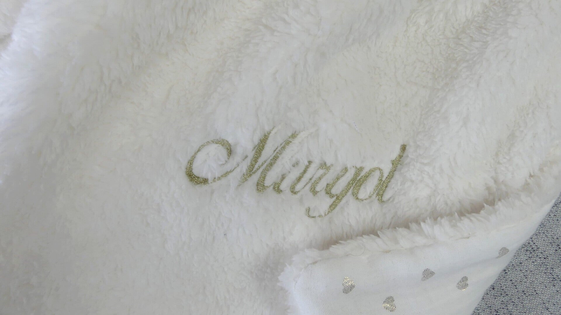 Face brodée : sur la fausse fourrure Sherpa (broderie 25 cm maxi en fonction du prénom).