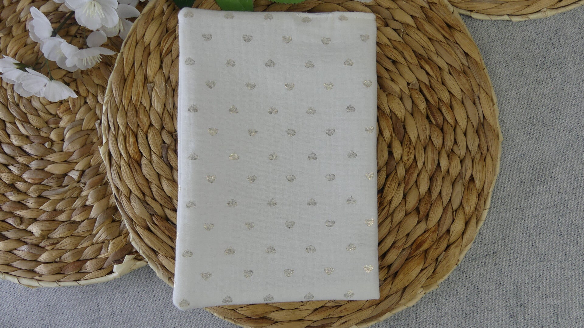 > Carnet de santé : Extérieur réalisé en coton double gaze coeurs dorés, ainsi que les 2 retours intérieurs. Intérieur en Enduit imperméable. Broderie du prénom réalisée à la machine avec du fil spécial brodeuse.