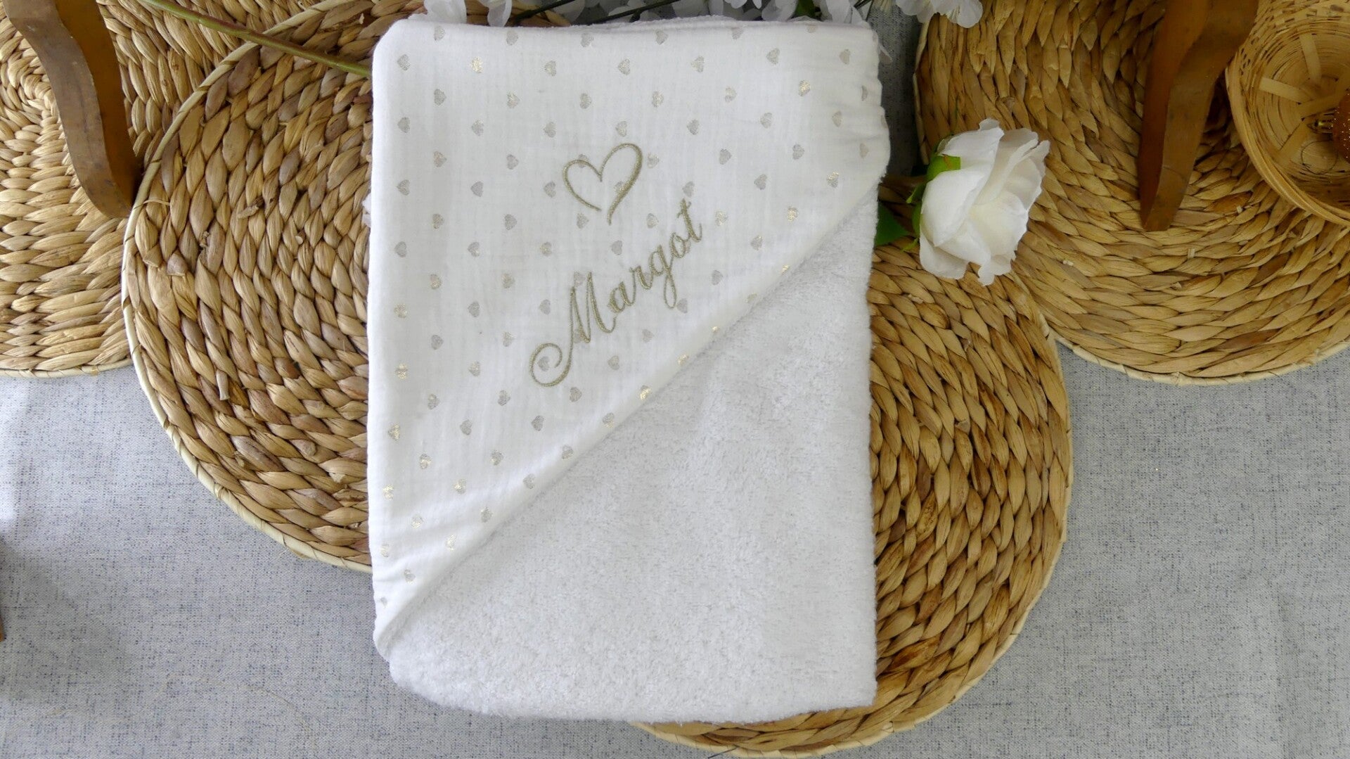 Cette sortie de bain est brodée et ensuite cousue, pour éviter le frottement de la broderie en contact avec la tête de l'enfant. voir photo