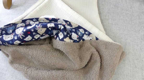 - Cape de bain 73 x 73 cm Entièrement doublée. Réalisée en éponge bouclette et éponge bambou (blanc). Doublée en double gaze écru.