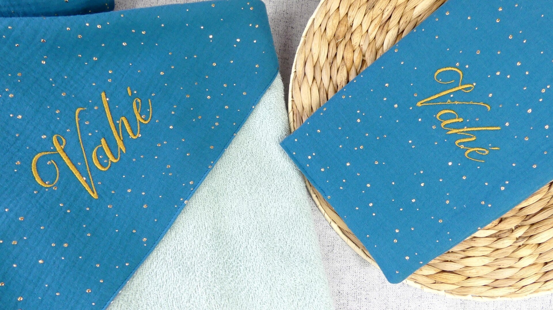 Personnalisation du prénom sur l'ensemble du trousseau de naissance en broderie machine avec du fil spécial brodeuse de couleur doré.