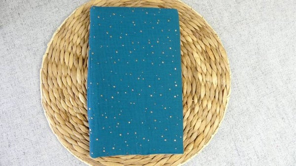 Double gaze bleu canard à pois dorés pour l'extérieur, l'intérieur en tissu enduit lavable.