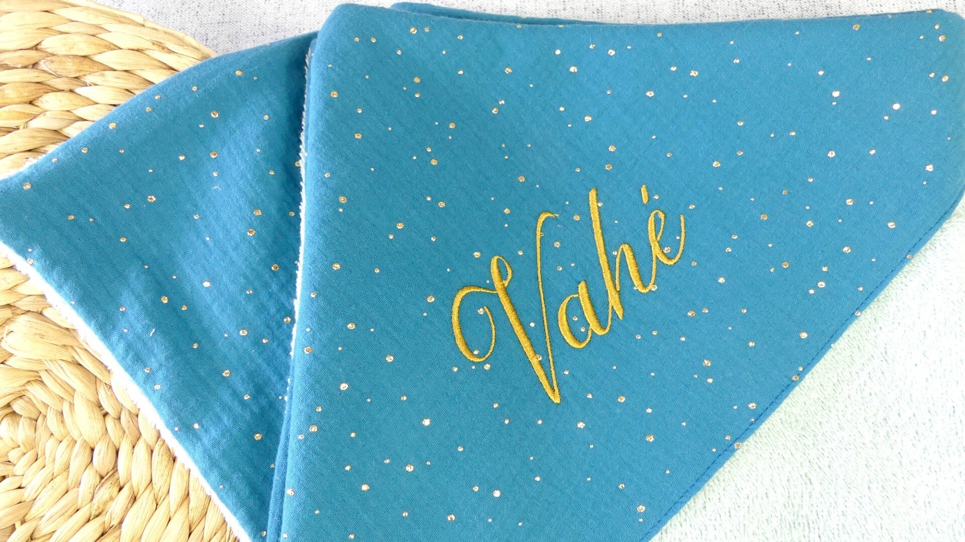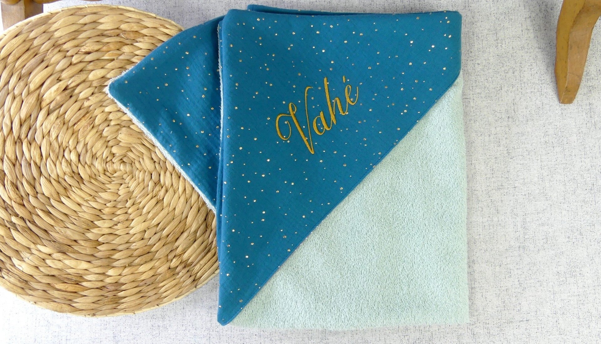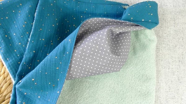 Cette cape est réalisée en éponge bouclette vert d'eau, doublée en double gaze bleu canard à pois dorés.