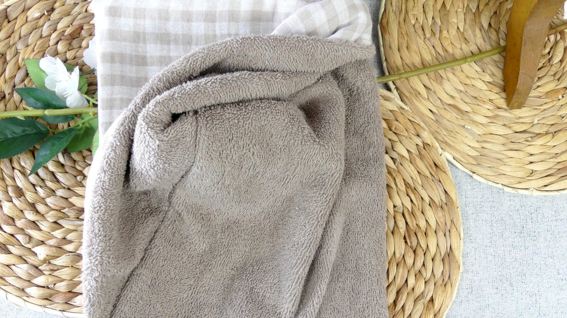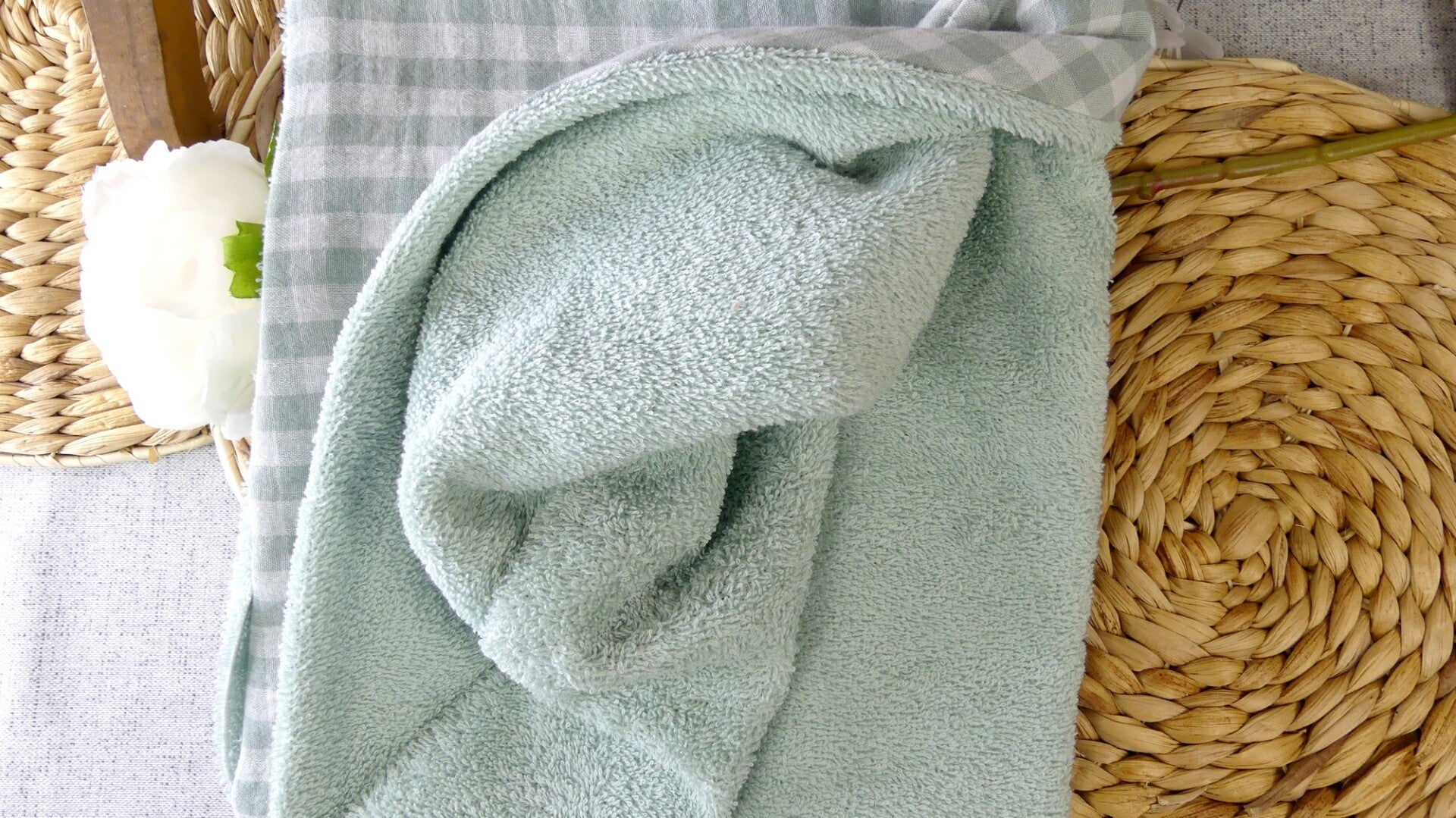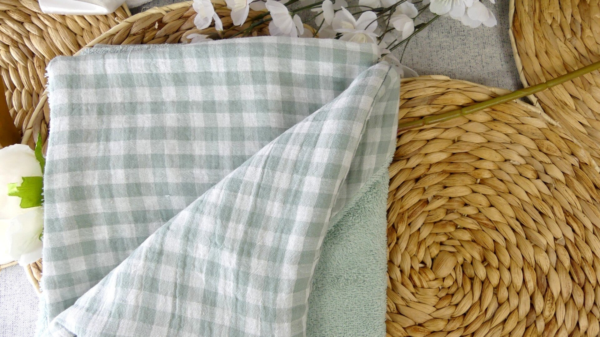 La cape est entièrement doublée réalisée en coton double gaze (2 coloris) et doublée en éponge bouclette coton vert d'eau ou taupe.
