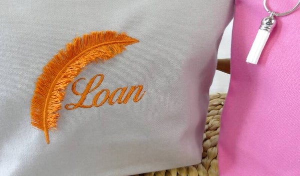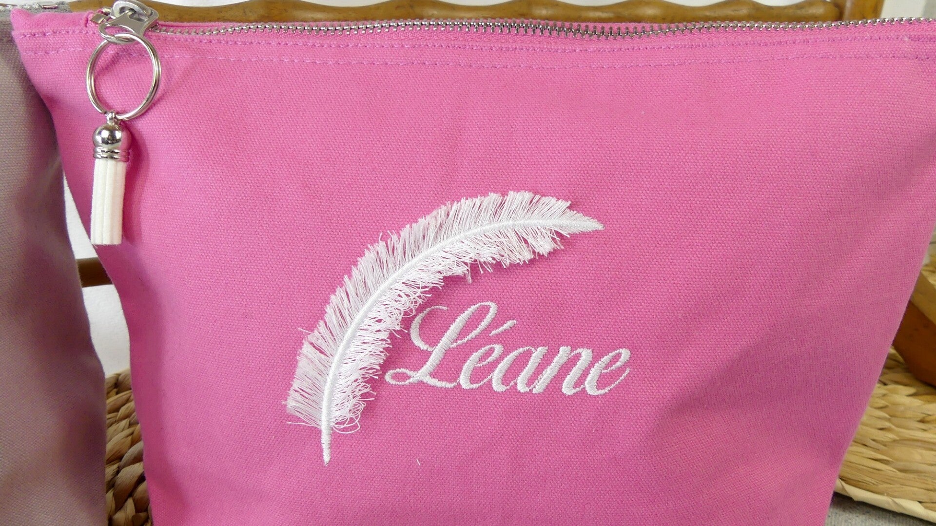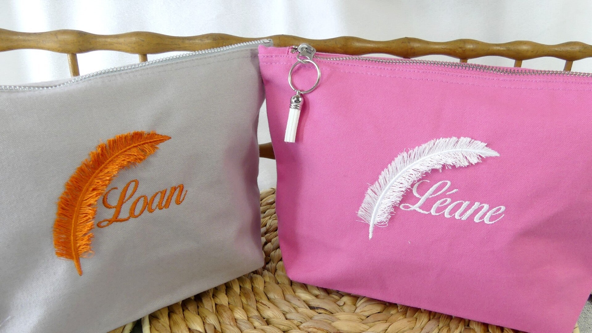 Offrez cette ravissante trousse brodée à la machine avec un fil spécial brodeuse, par le prénom de l'enfant et sa plume.