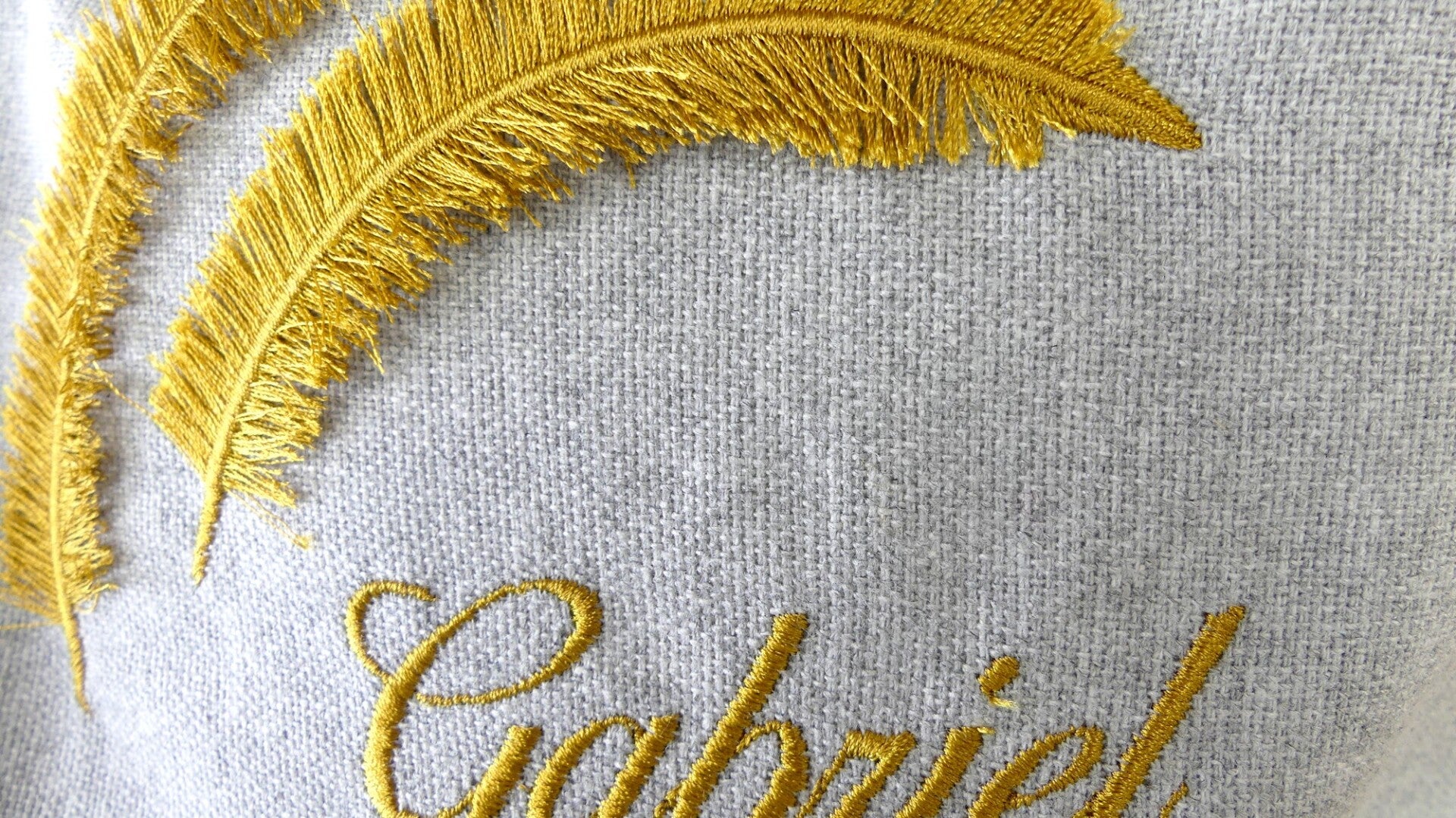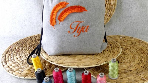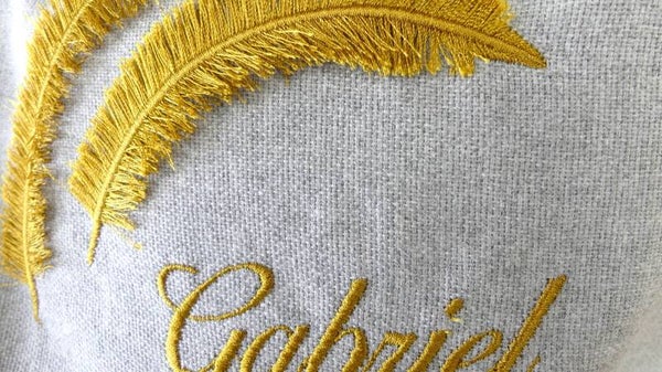 Le prénom et les plumes sont brodés directement sur le tissu du sac.