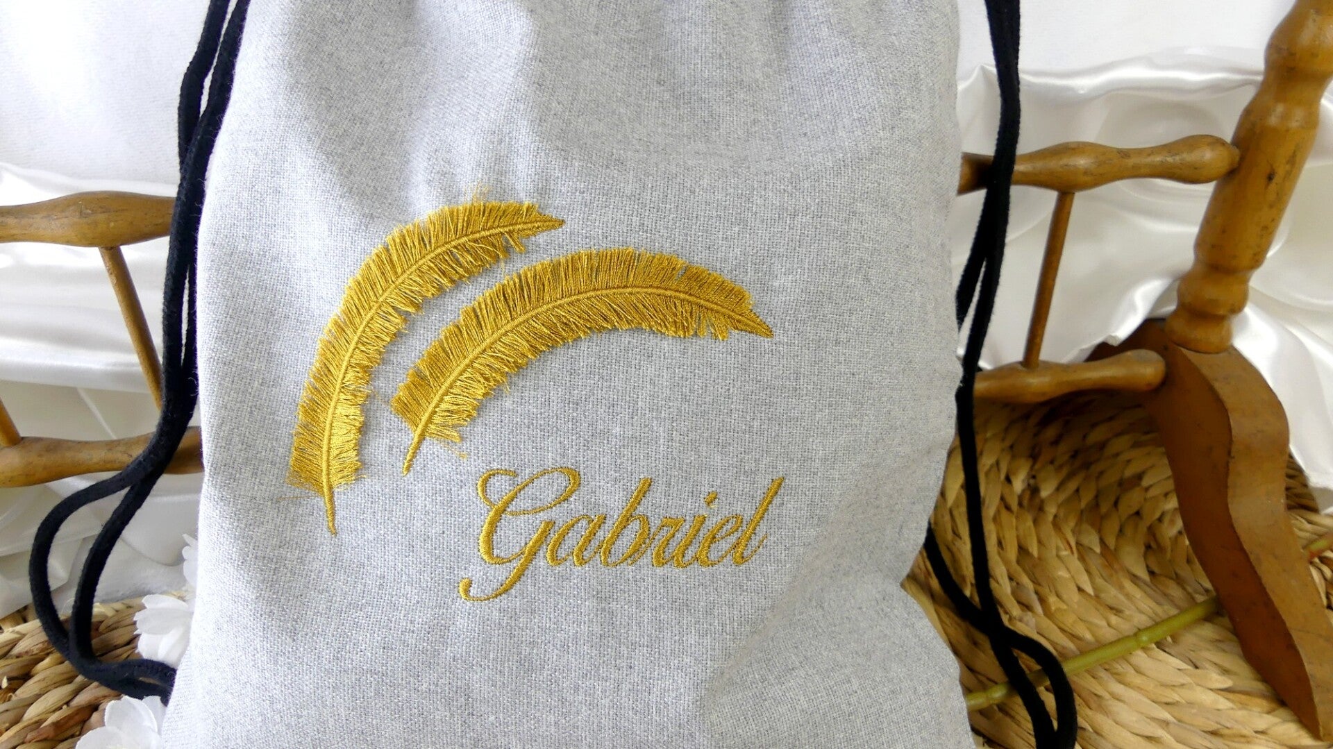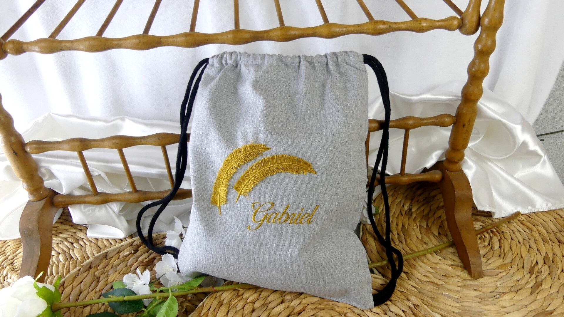 Laissez vous séduire par ce ravissant sac à dos ficelle personnalisé par un prénom et ses 2 plumes brodées en 3D.
