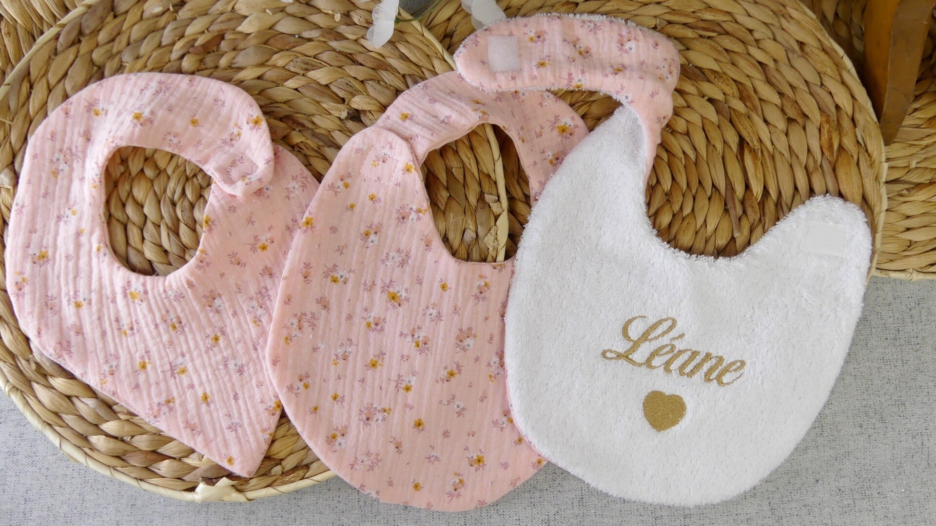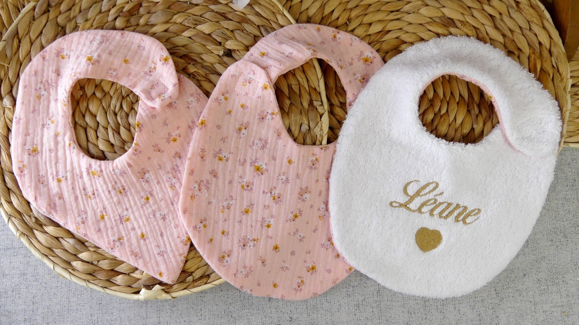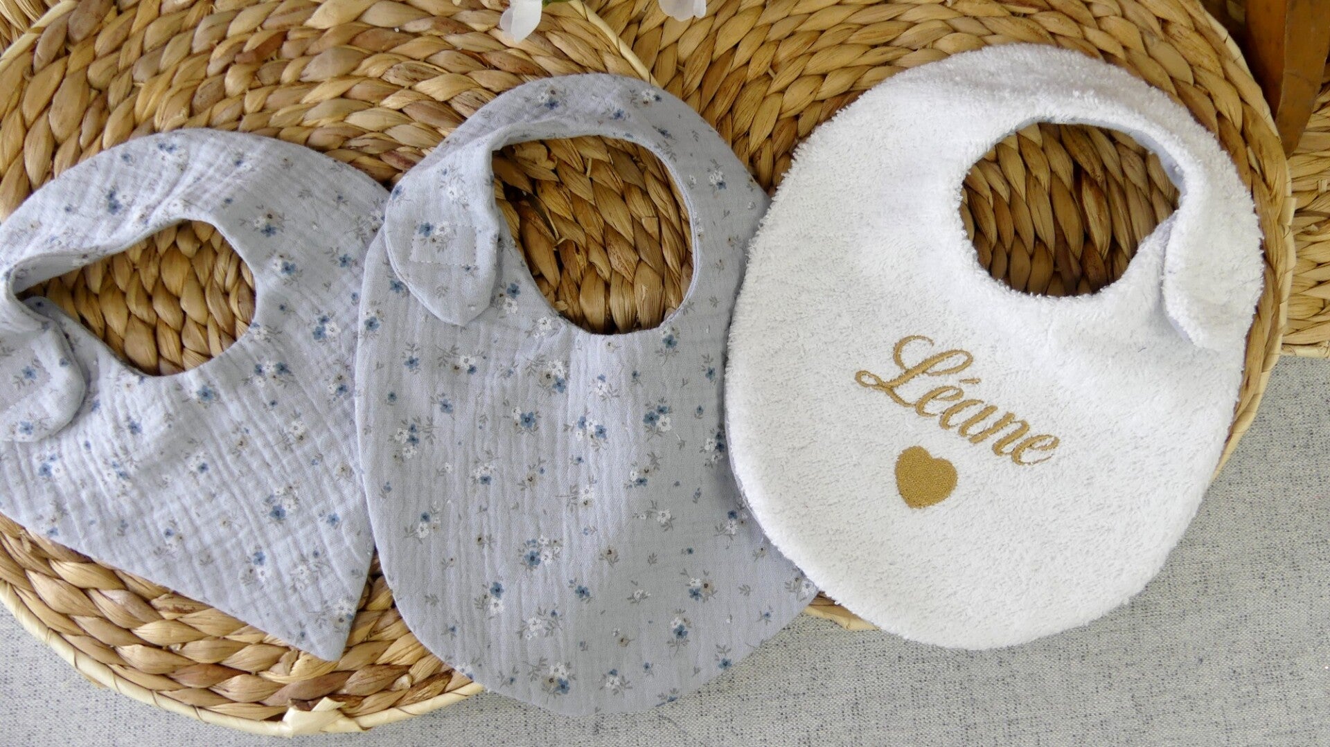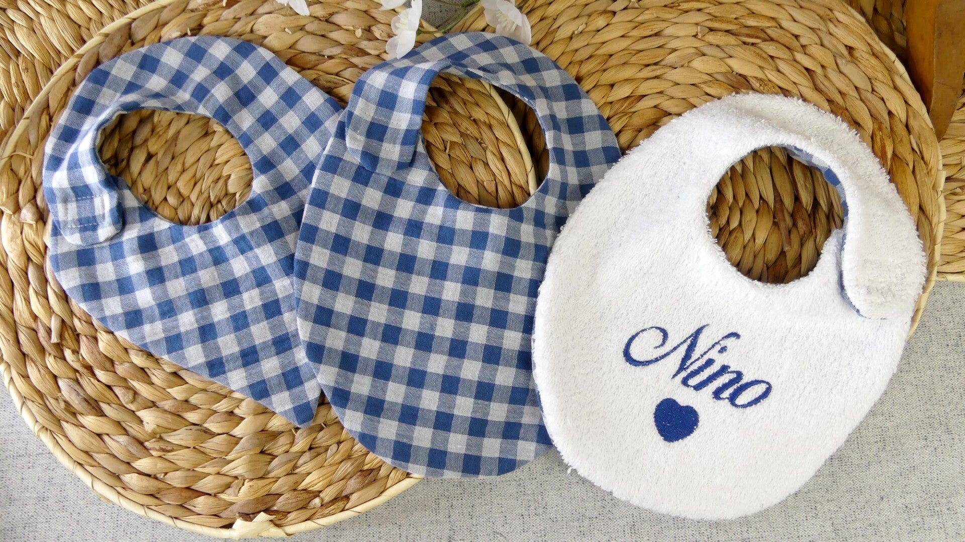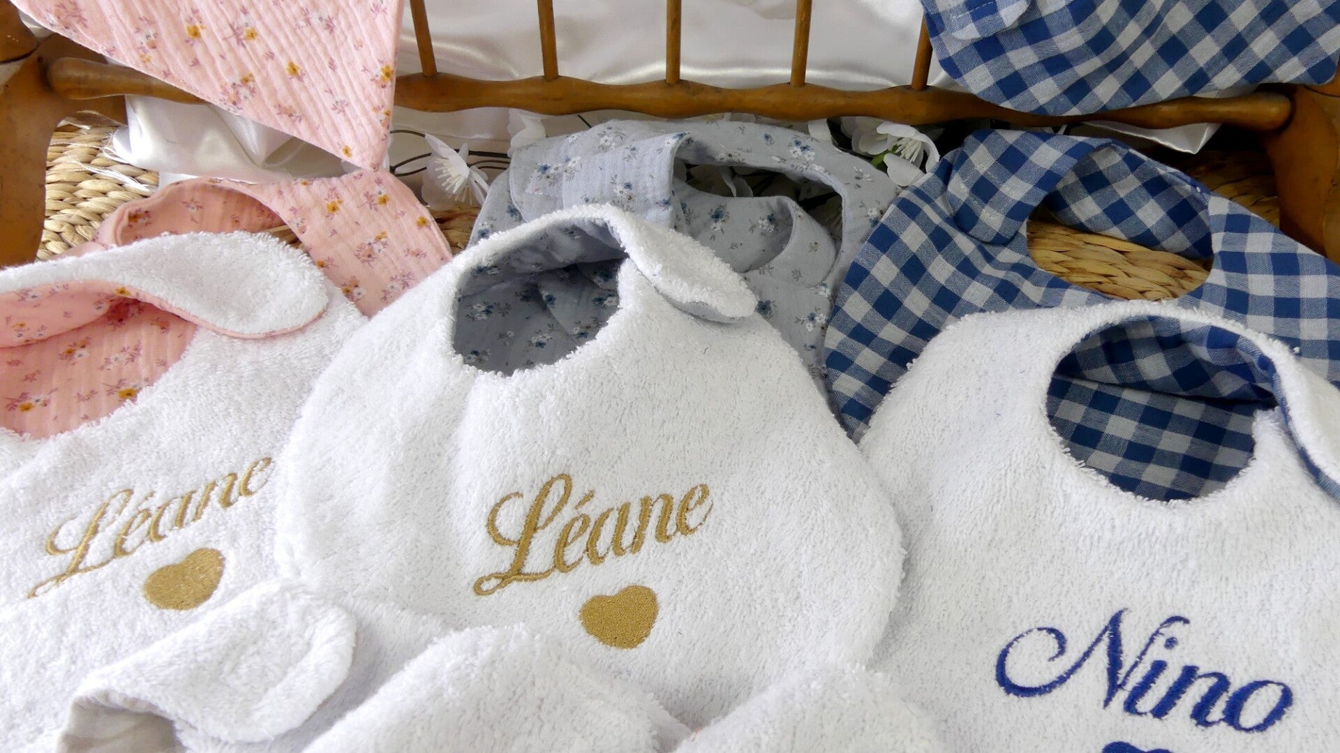 La broderie est réalisée de manière à ne pas être visible au dos du bavoir.