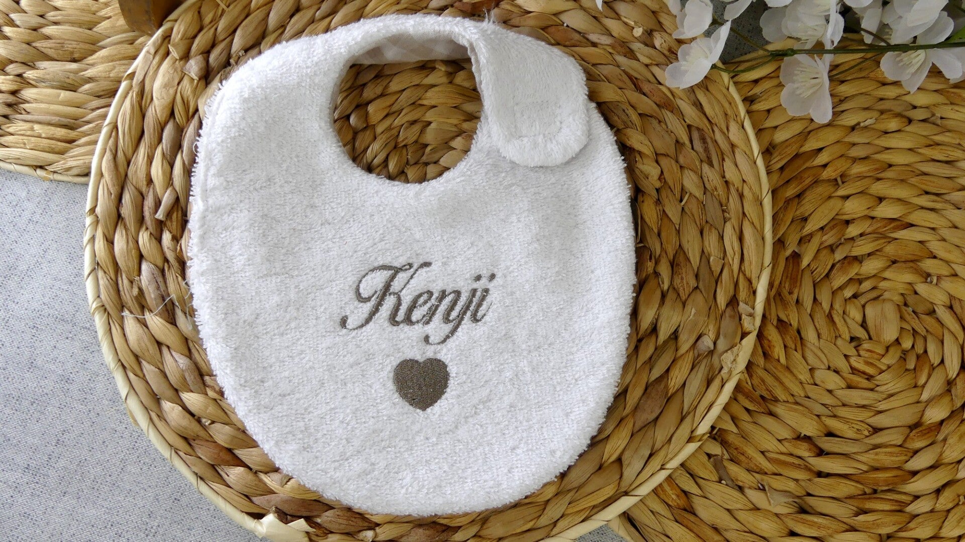 La personnalisation est entièrement réalisée en broderie (prénom + coeur).