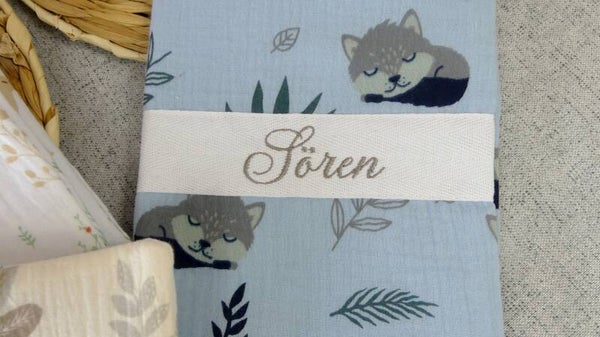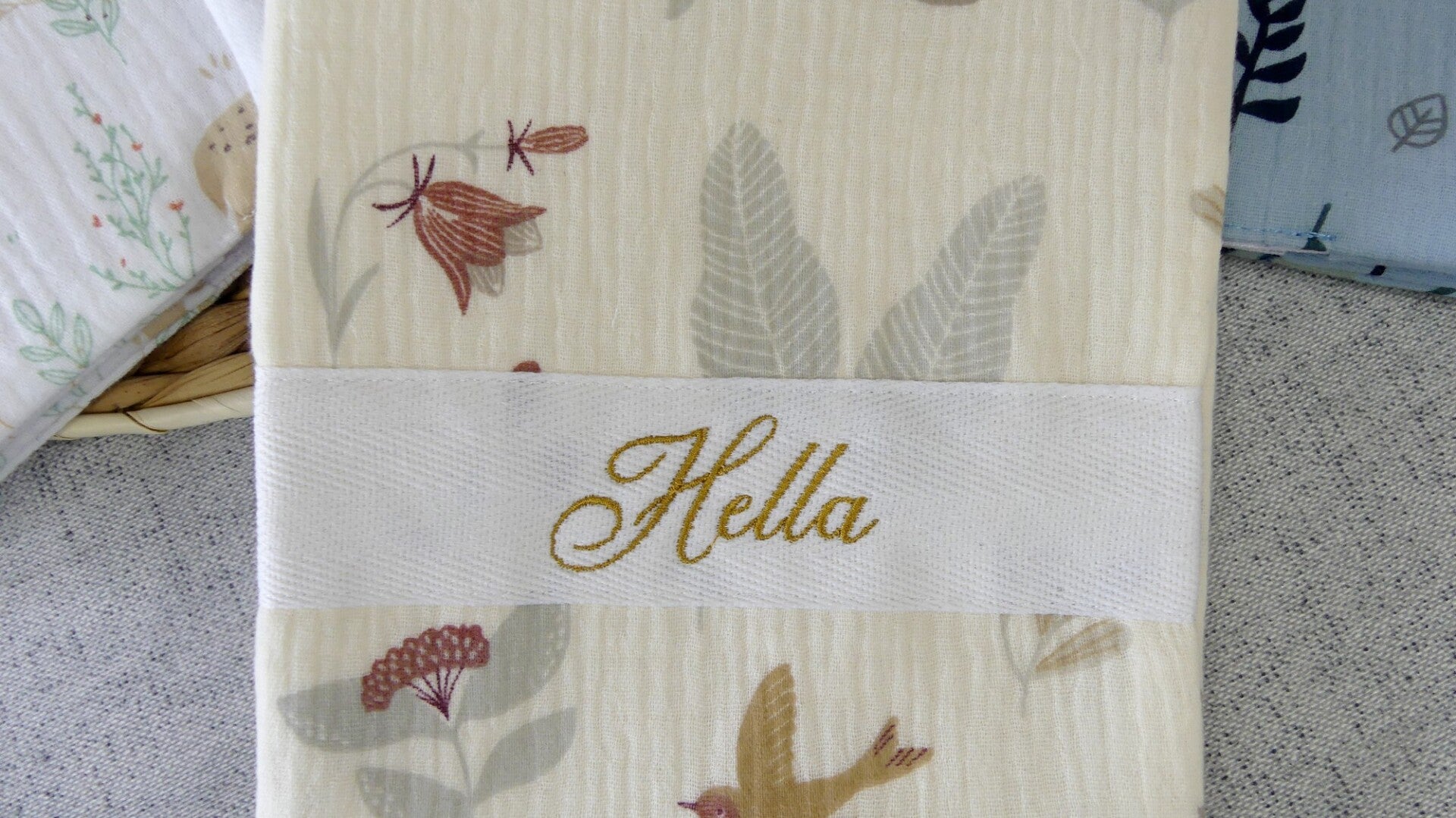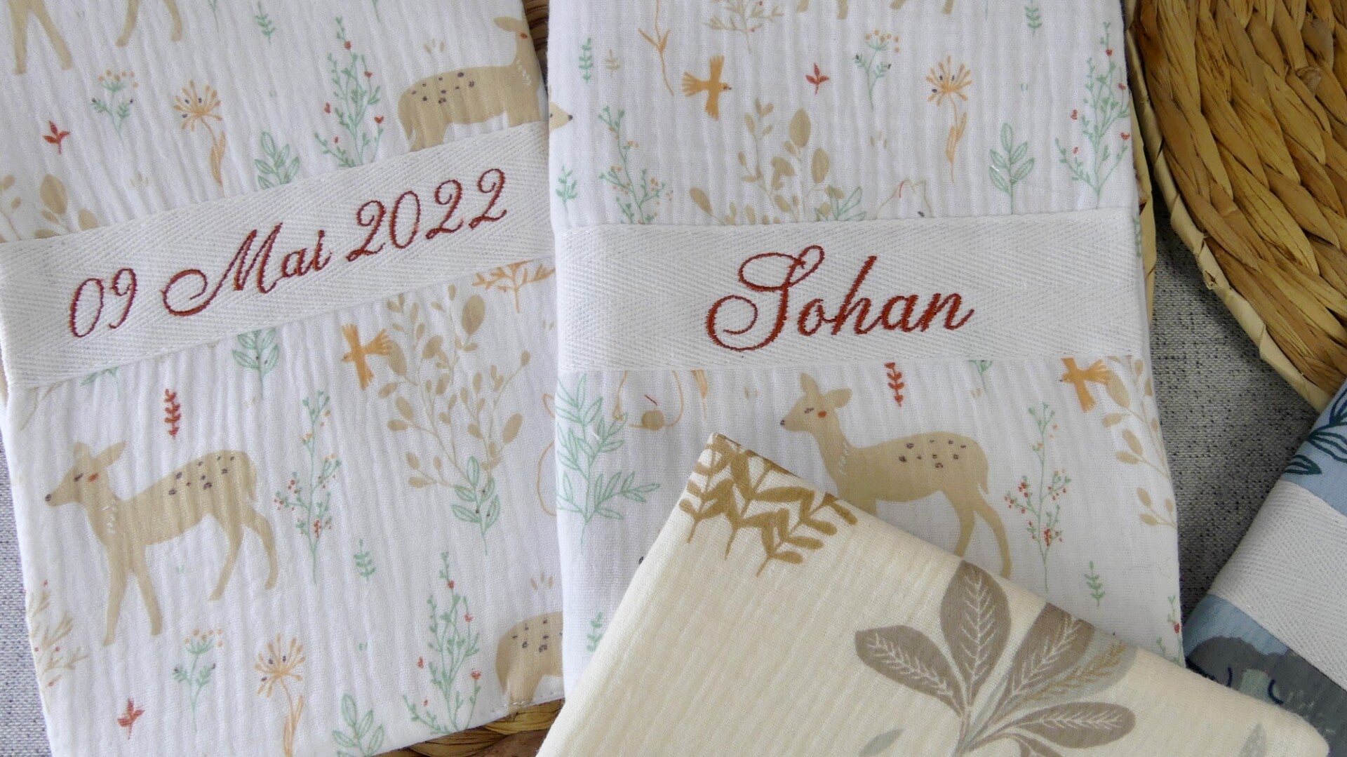 Un cadeau unique personnalisé en broderie avec le prénom de l'enfant et la date de naissance.
