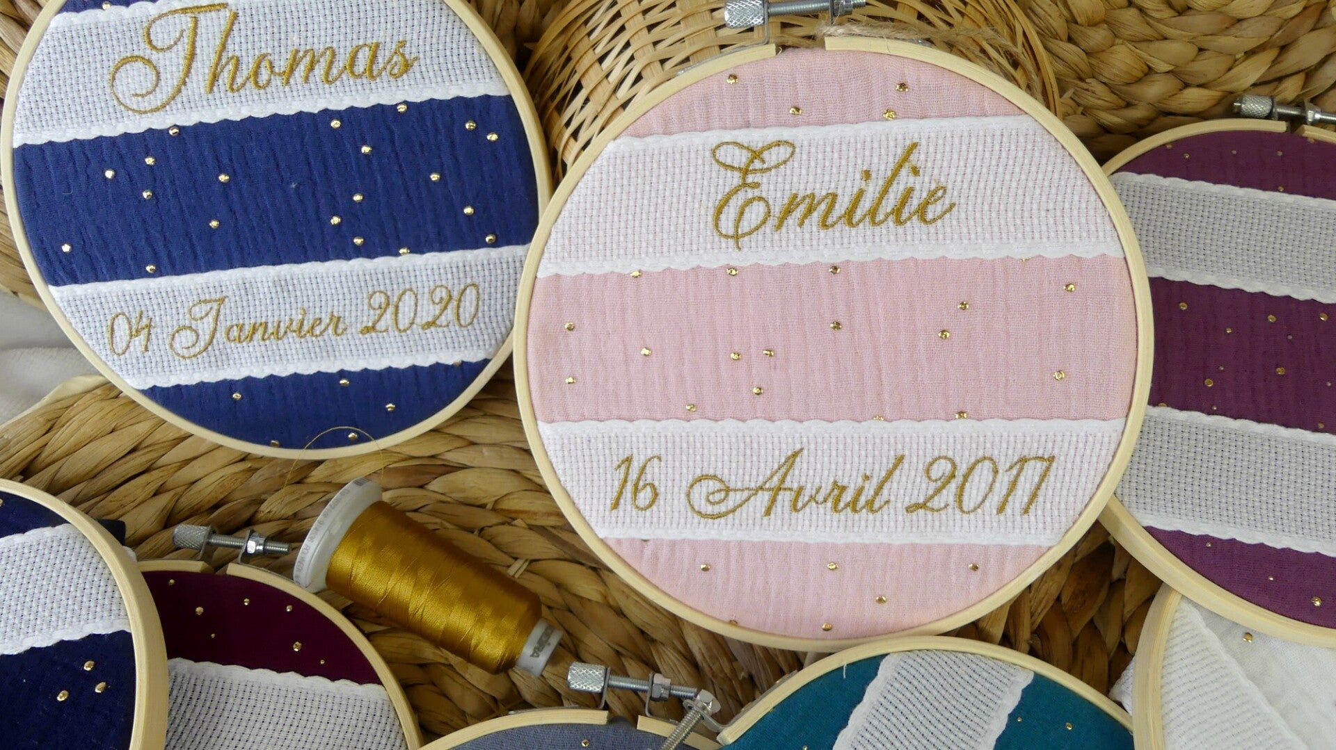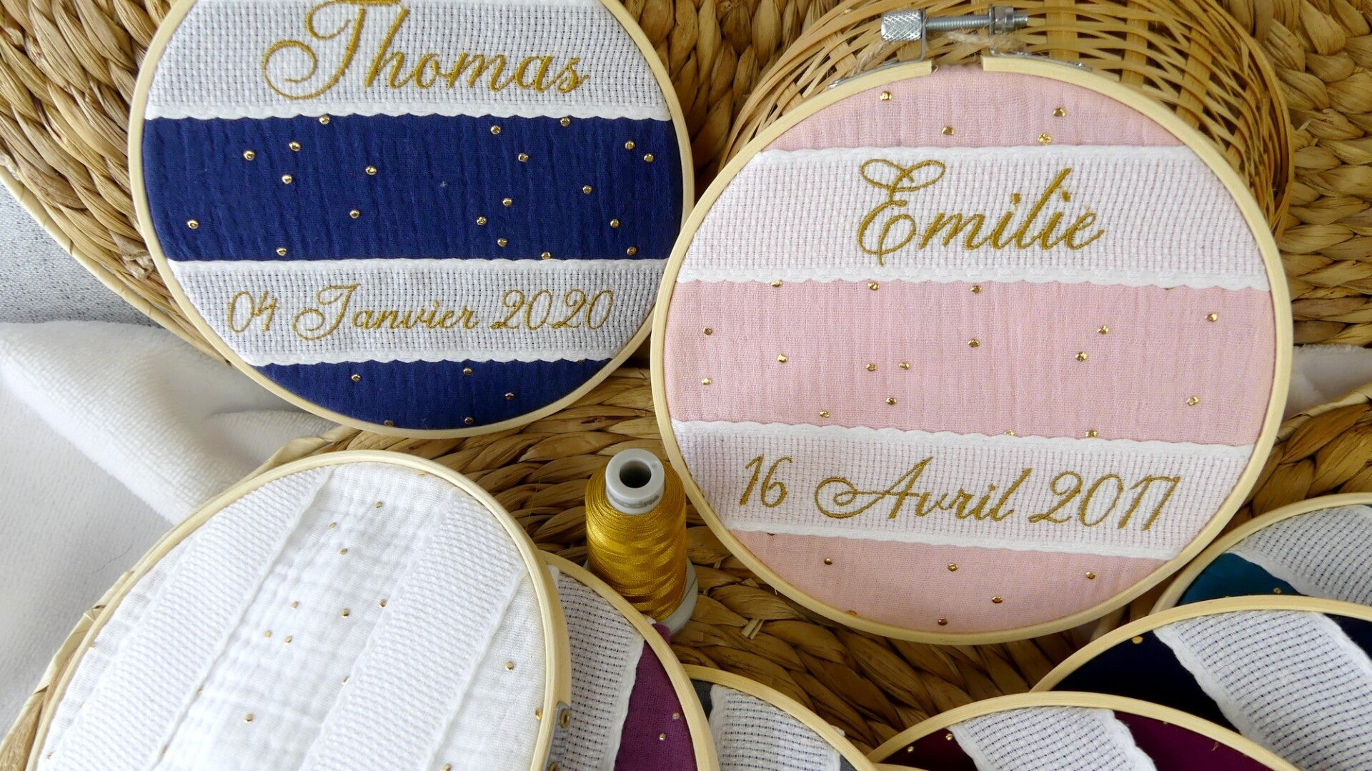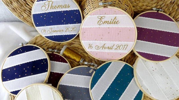 Cadeau enfant personnalisé en broderie sur un tambour cerceau à suspendre au mur ou à poser sur un meuble dans la chambre de l'enfant.