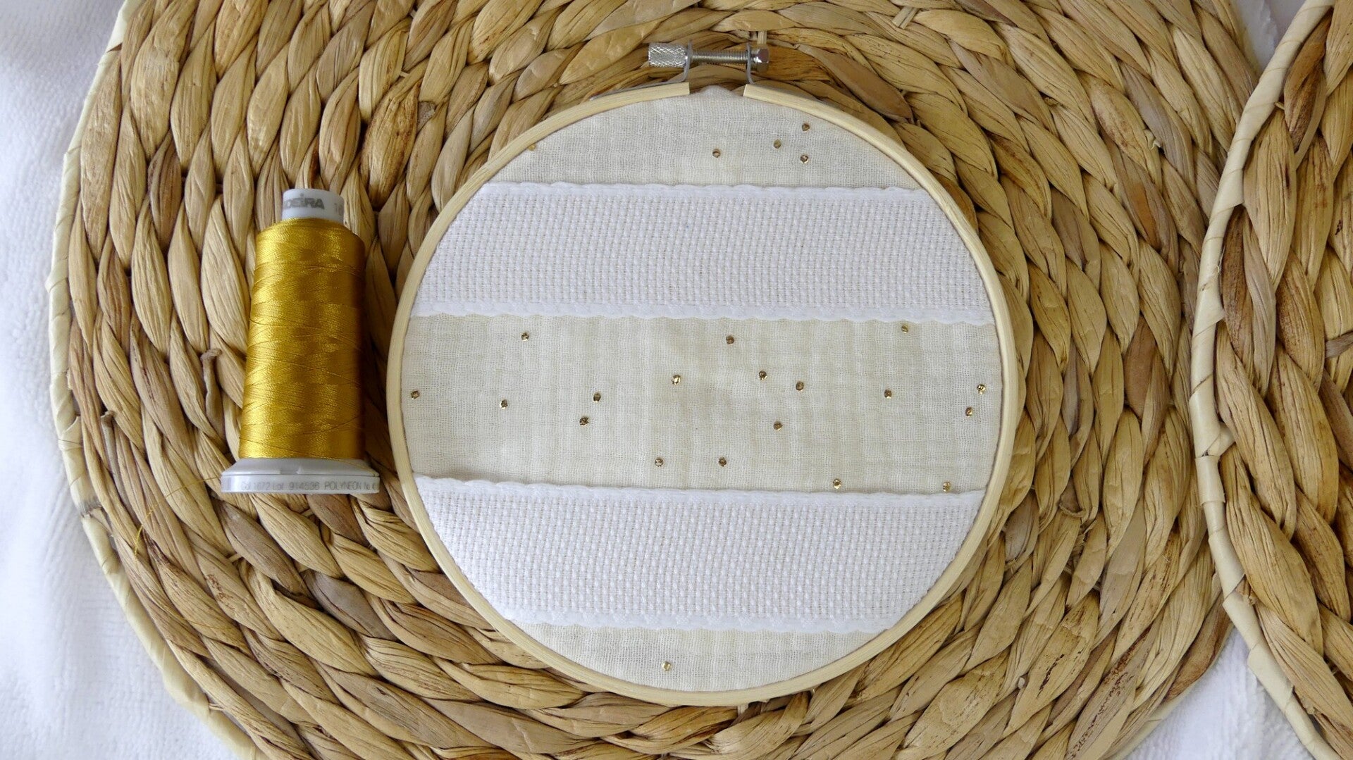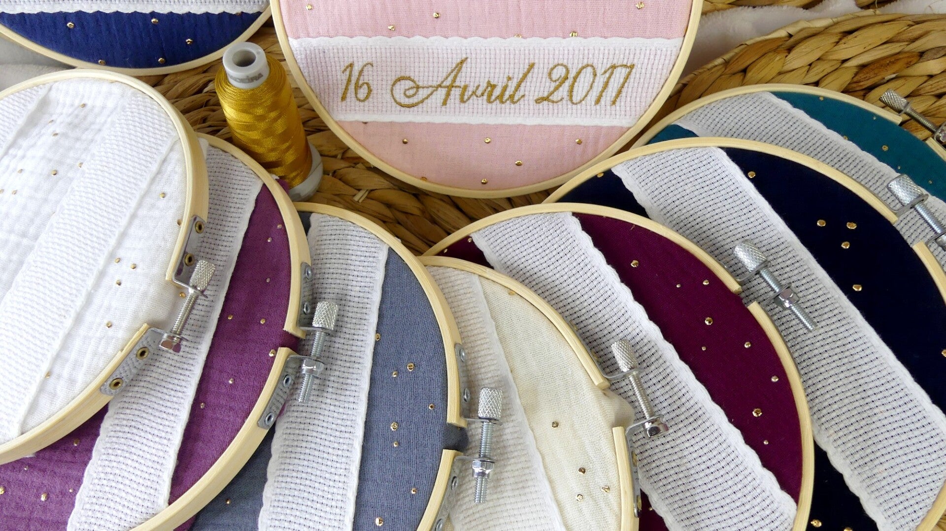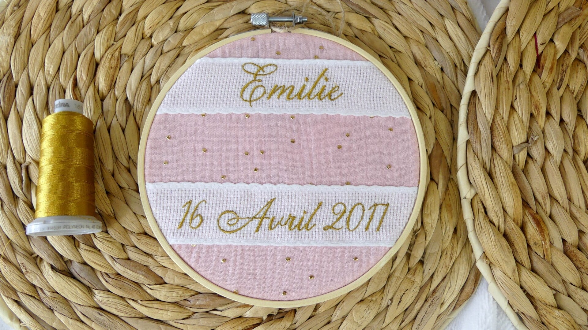 La personnalisation (prénom et date de naissance) est brodée sur une bande "Aida", qui est ensuite cousue sur le tissu double gaze à pois dorés.