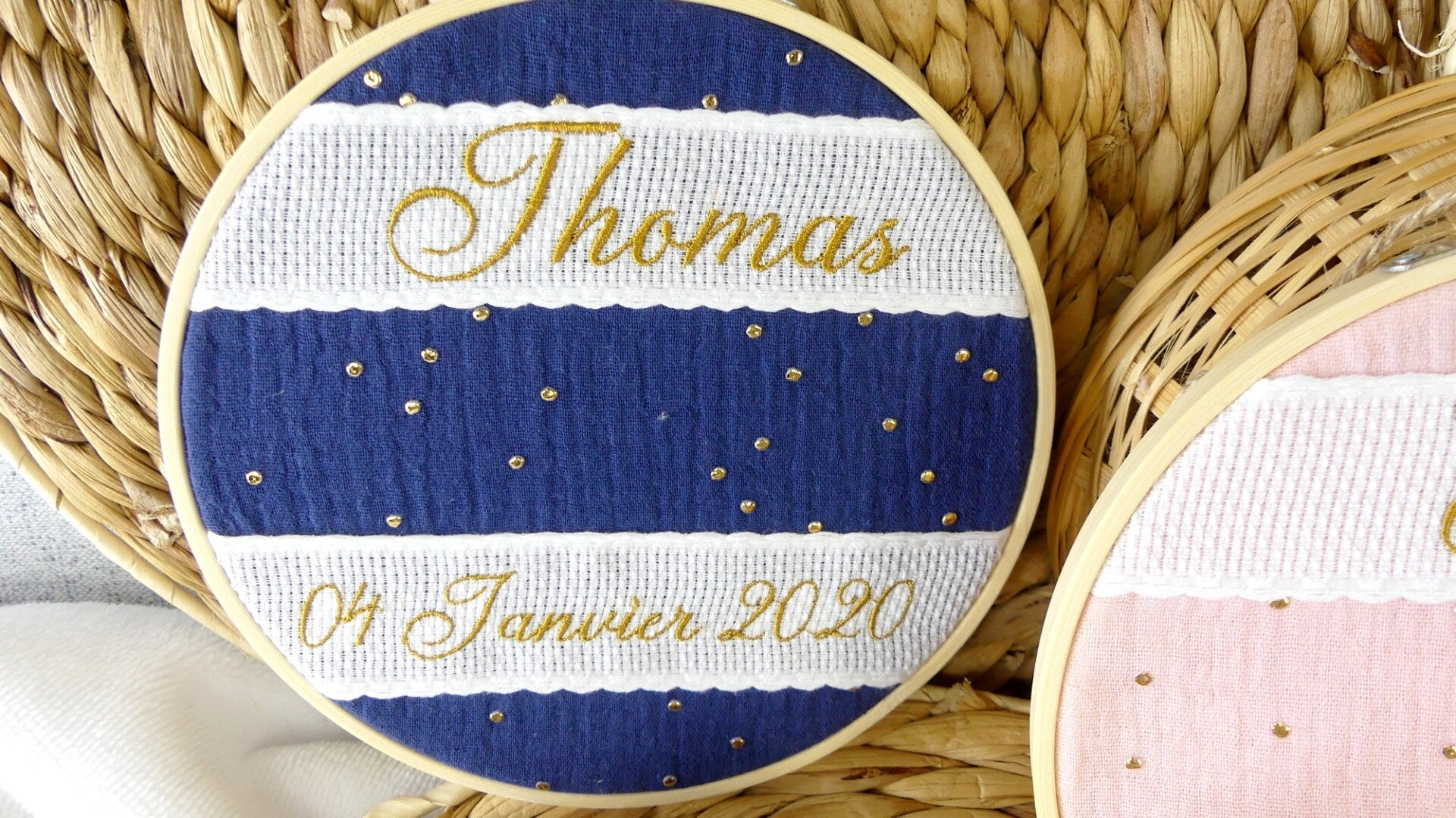 Cadre décoration double gaze Pois Dorés brodé prénom et date de naissance