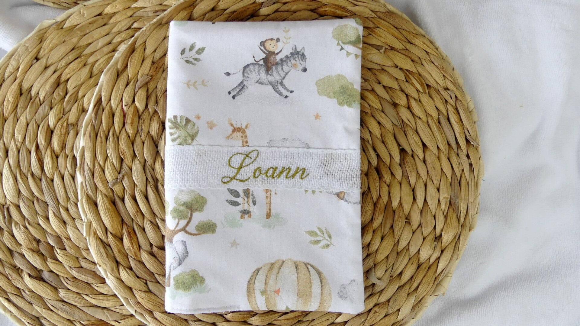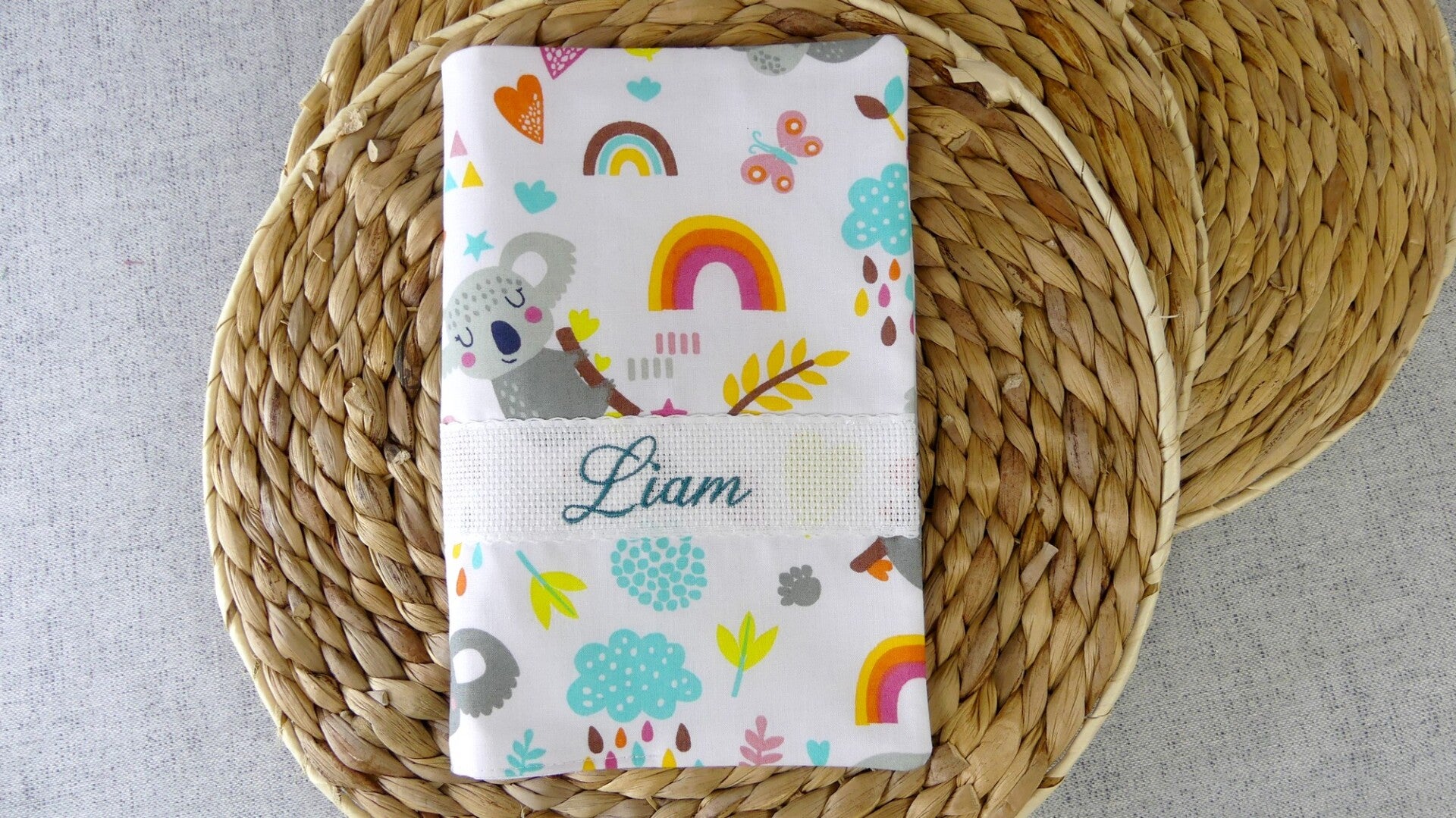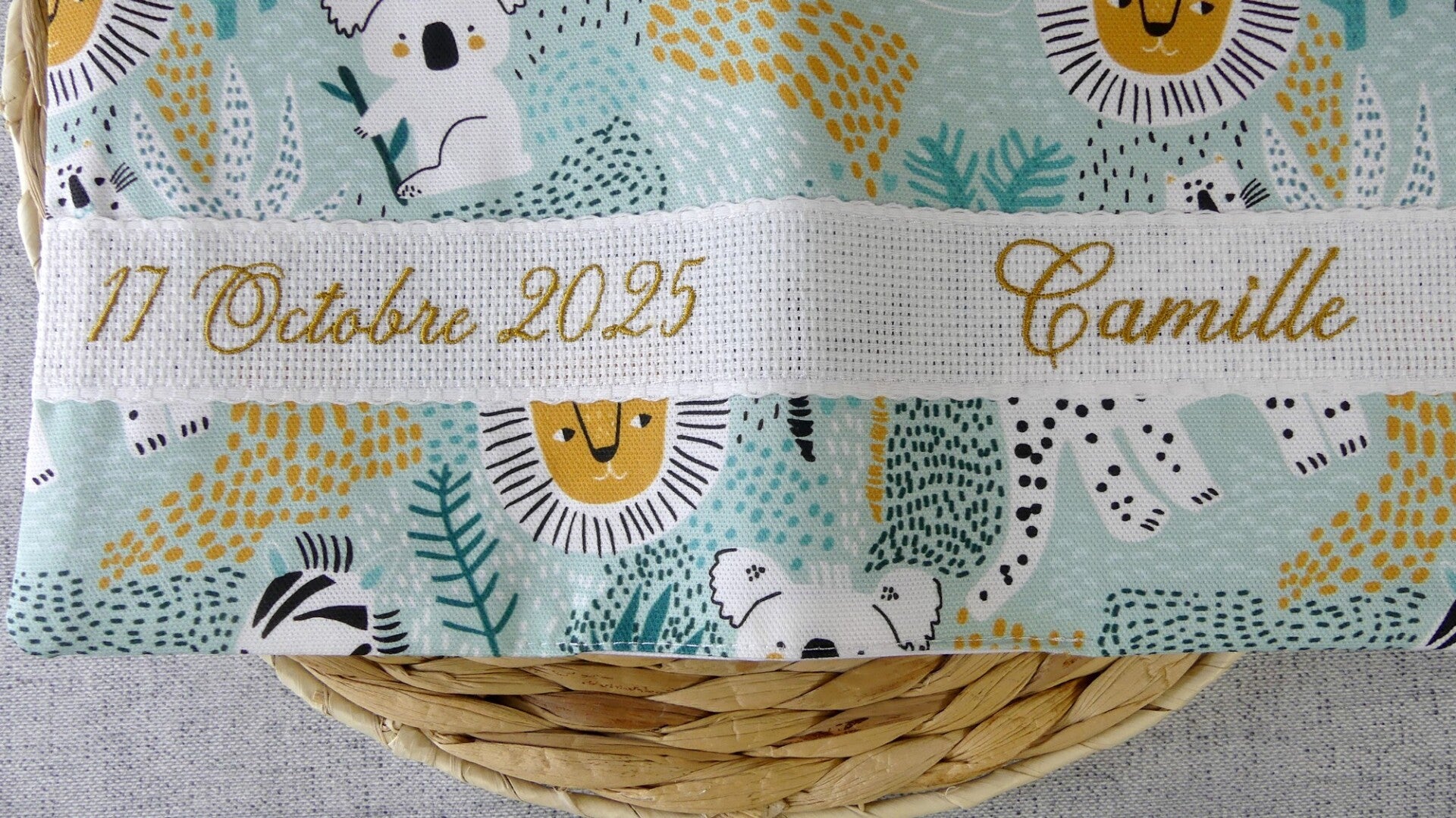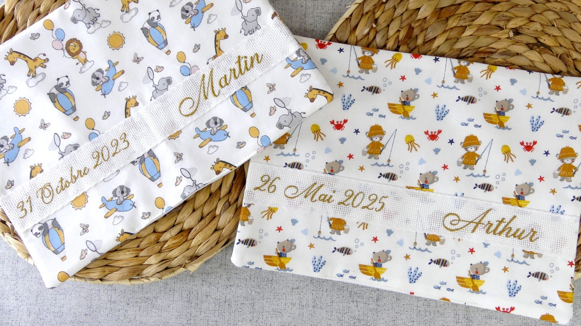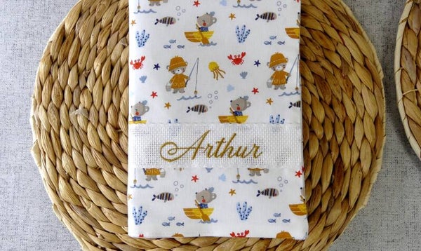 Un cadeau unique personnalisé en broderie avec le prénom de l'enfant et la date de naissance.