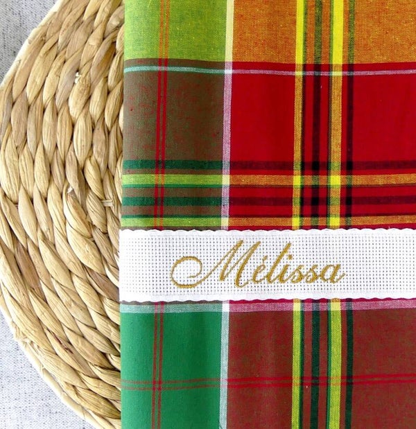 > Broderie réalisée à la machine avec du fil spécial brodeuse sur un galon à broder "Aida" de couleur blanc.