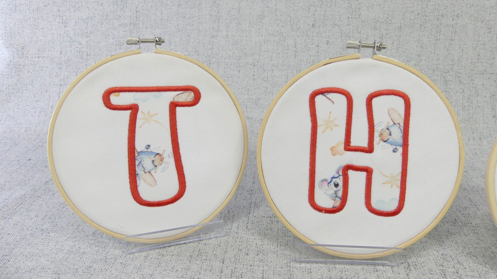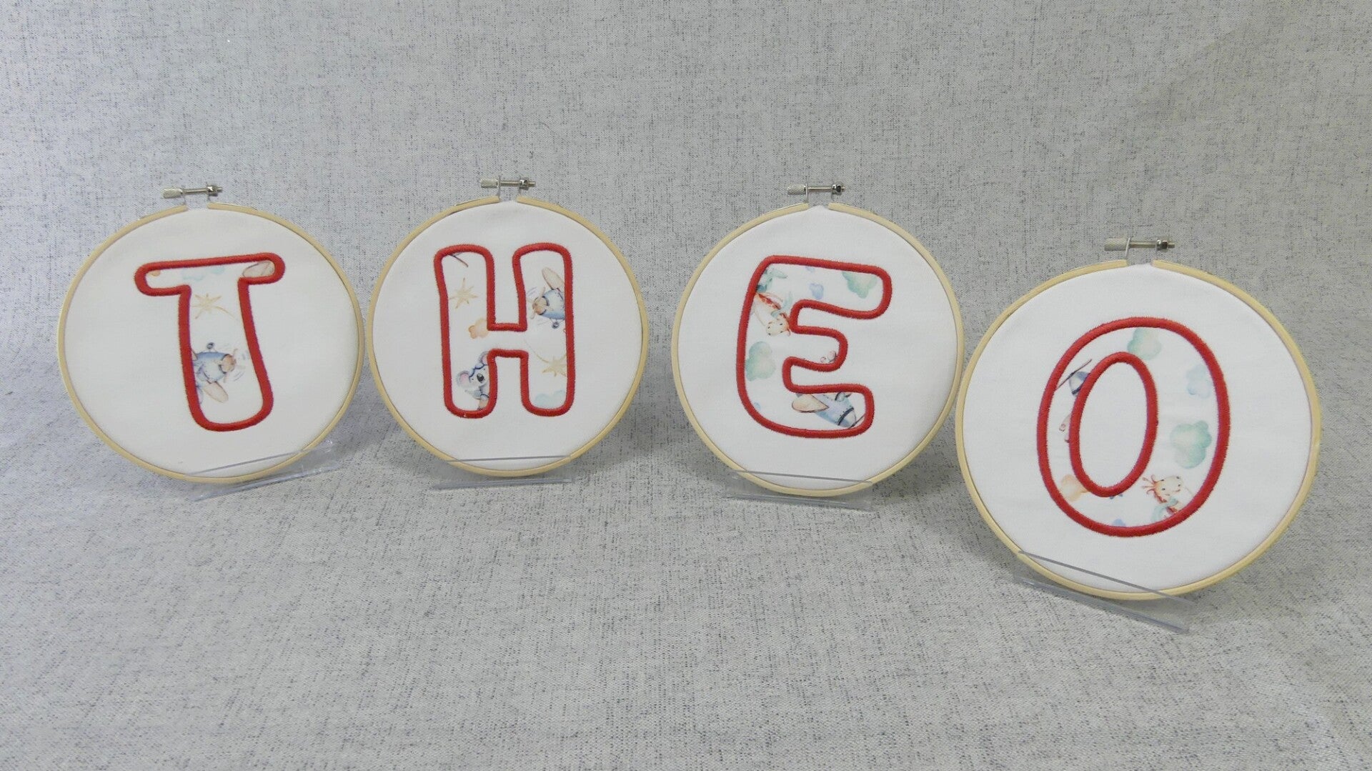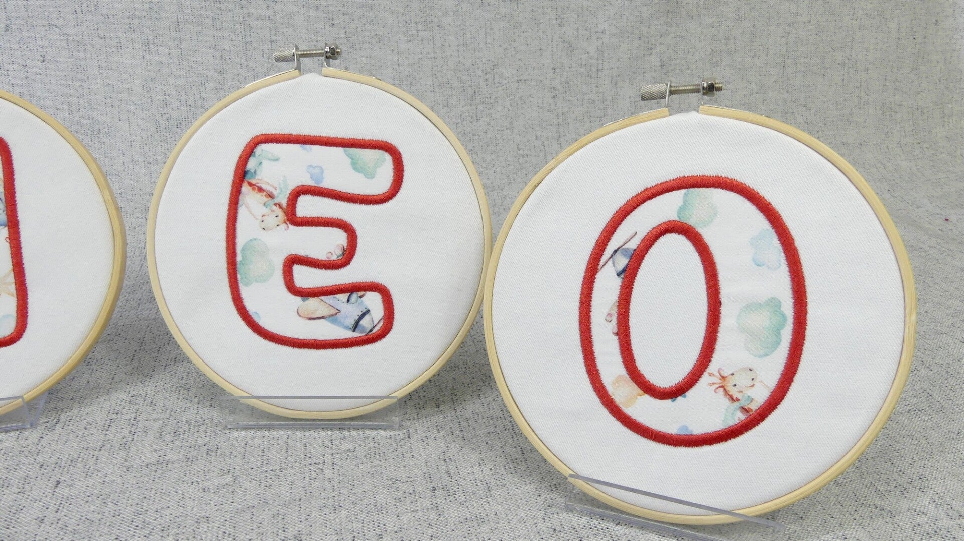 > Chaque lettre du prénom est brodée sur un cadre de diamètre 15 cm.